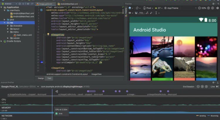 プロジェクトには、appとGradle Scriptsの2つのルートフォルダがあります。最初のフォルダには、設定やソフトウェアのソースコードを含む3つのフォルダがあります。2つ目には、プロジェクトをビルドするためのデータセットが含まれています。ファイルエディタでは、視覚化を使ってコードを修正することができます。これを行うために、特別な xml ファイル編集ツールがプログラムに組み込まれています。