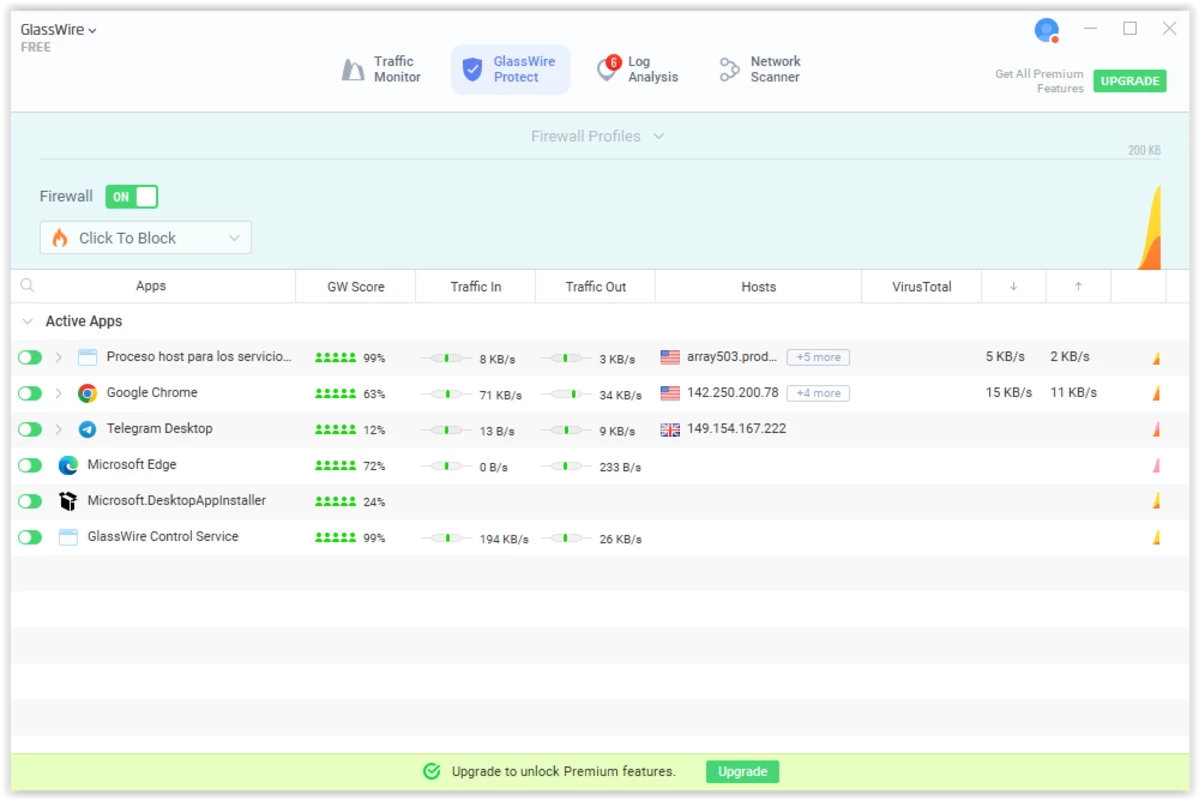 - Графічне представлення: GlassWire має інтуїтивно зрозумілий графічний інтерфейс, який чітко відображає мережеву активність у часі. Користувачі можуть помітити сплески використання даних і визначити точні моменти, коли певні програми споживали великі обсяги даних.
