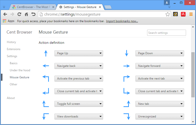 - Жести миші:Cent Browser підтримує настроювані жести миші, що дозволяють користувачам виконувати звичні дії простими рухами миші. Ця функція підвищує ефективність і забезпечує більш інтуїтивно зрозумілу роботу в Інтернеті.