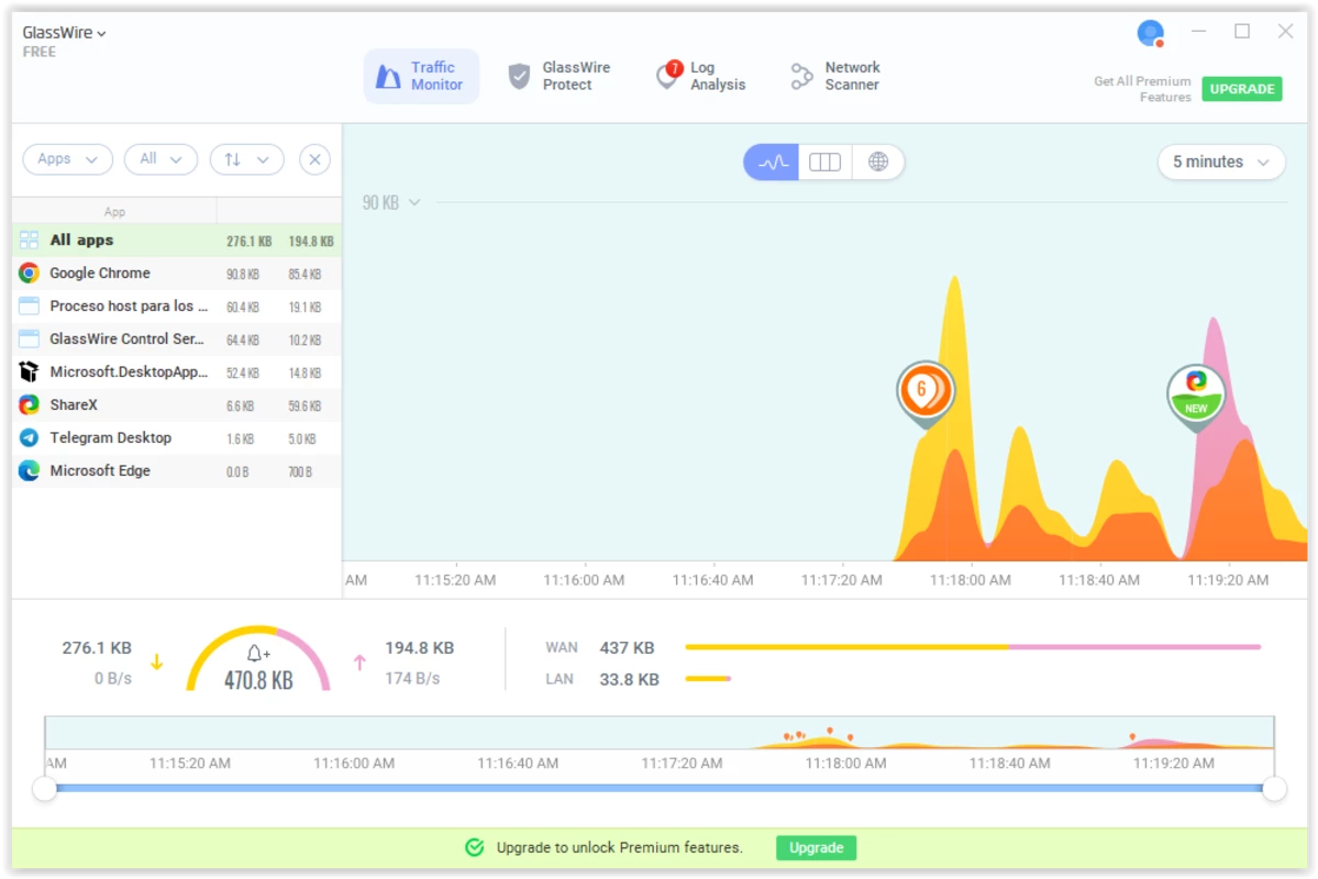 - Моніторинг мережі в режимі реального часу: GlassWire забезпечує моніторинг мережевої активності в режимі реального часу. Користувачі можуть бачити, які програми в даний момент використовують мережу, контролювати використання пропускної здатності і миттєво виявляти незвичайну активність.