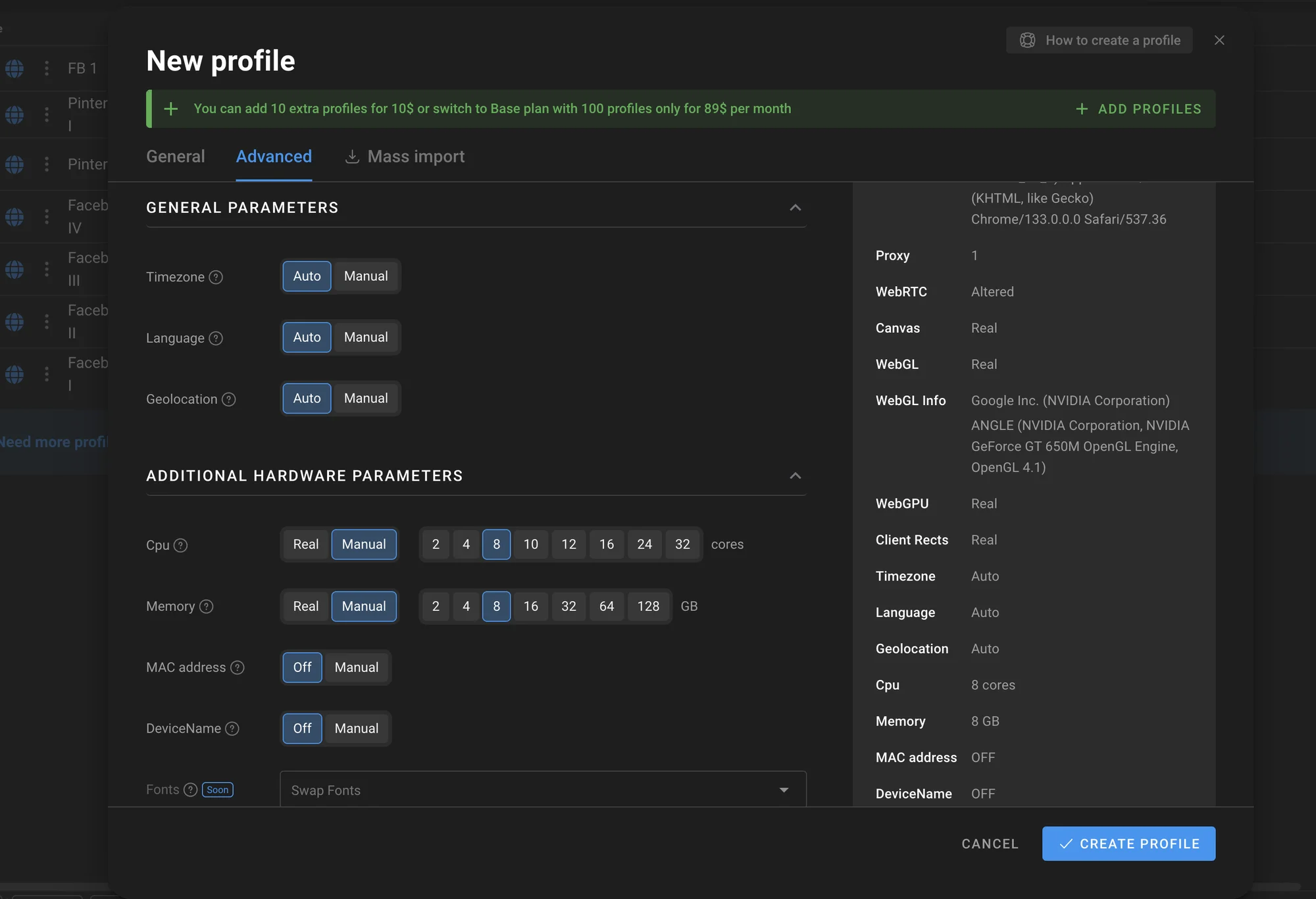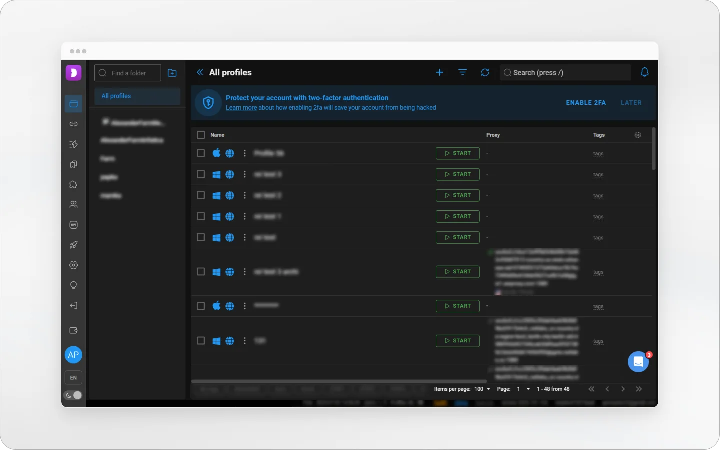 Integration with any proxy servers (SOCKS5, HTTP(S)) allows each profile to use a unique IP address.